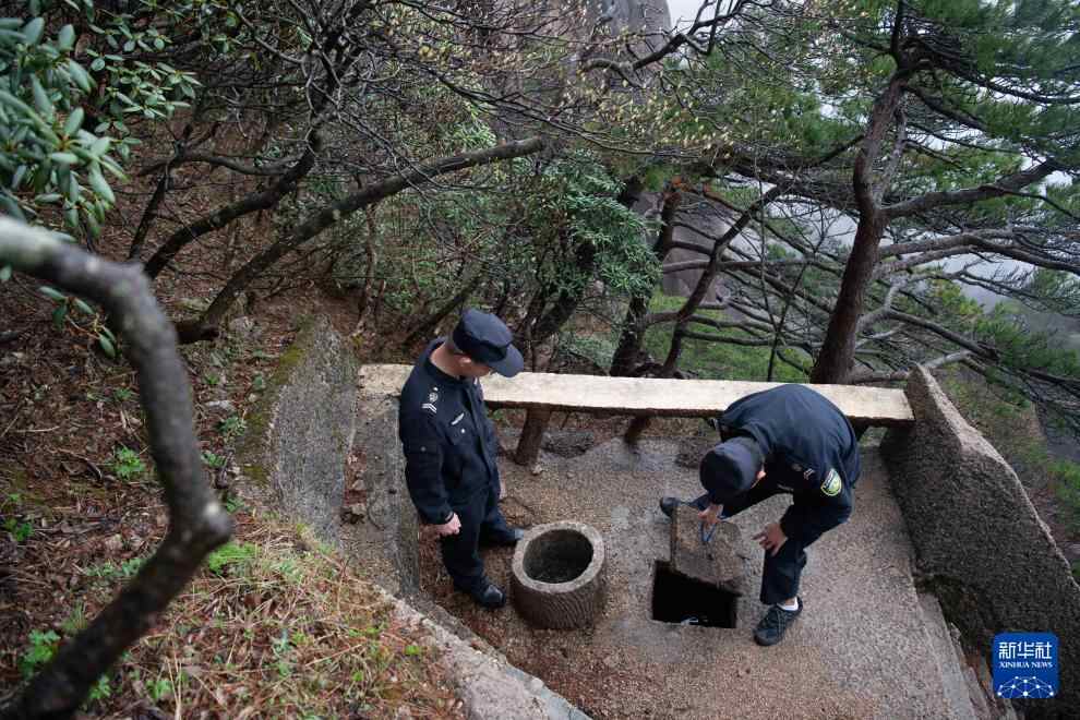 2025年4月22日,在封闭轮休中的莲花峰景点,黄山风景区管理委员会园林局护林防火队员查看防火水池蓄水情况。