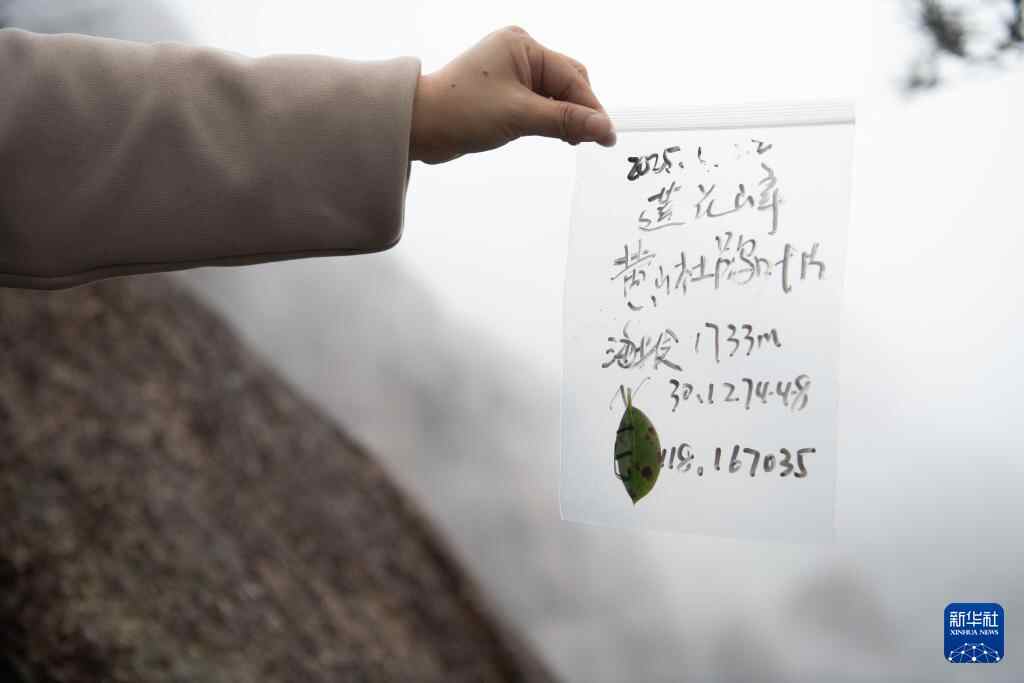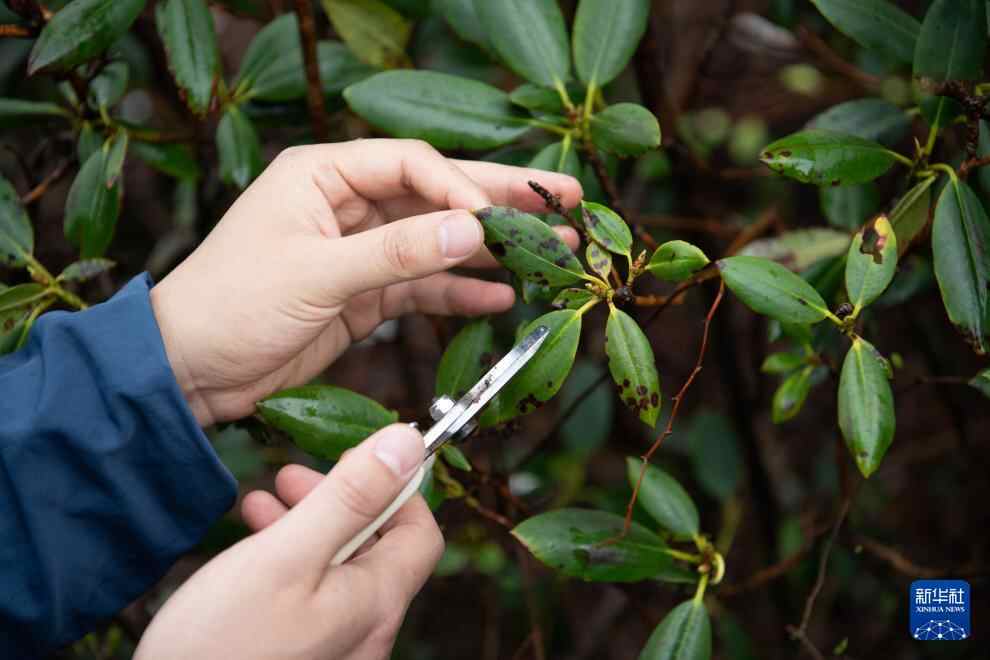 2025年4月22日,黄山风景区管理委员会园林局高级工程师吴贻军在封闭轮休中的莲花峰景点对黄山杜鹃病叶进行取样。