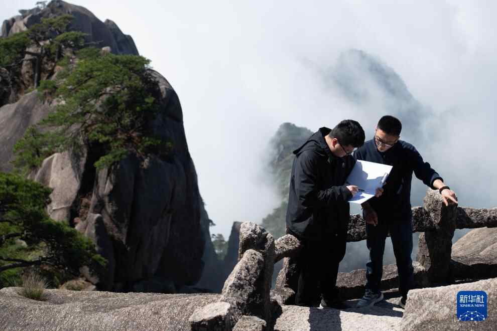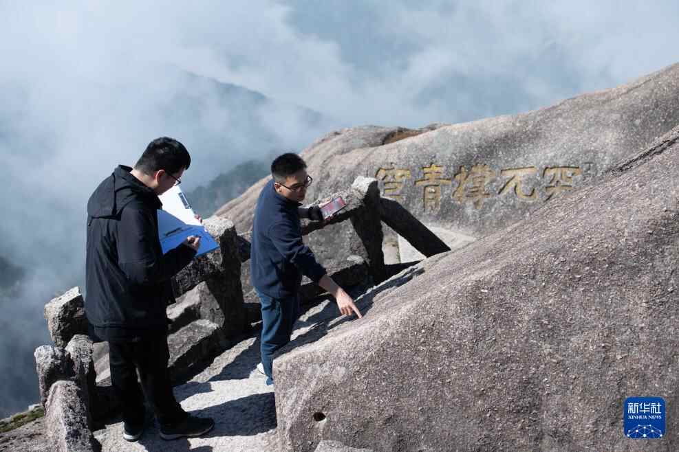 2025年4月23日,黄山风景区文化事业管理办公室副主任俞杨阳(右)与同事盛泽洋在封闭轮休中的莲花峰记录沿途石刻文物信息。
