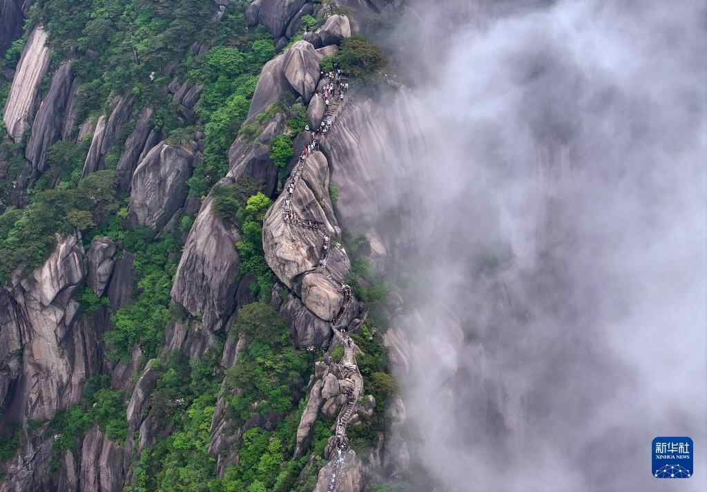 2024年5月20日,游客在黄山三大主峰之一天都峰游览(无人机照片)。当日,天都峰结束封闭轮休期,恢复对外开放。