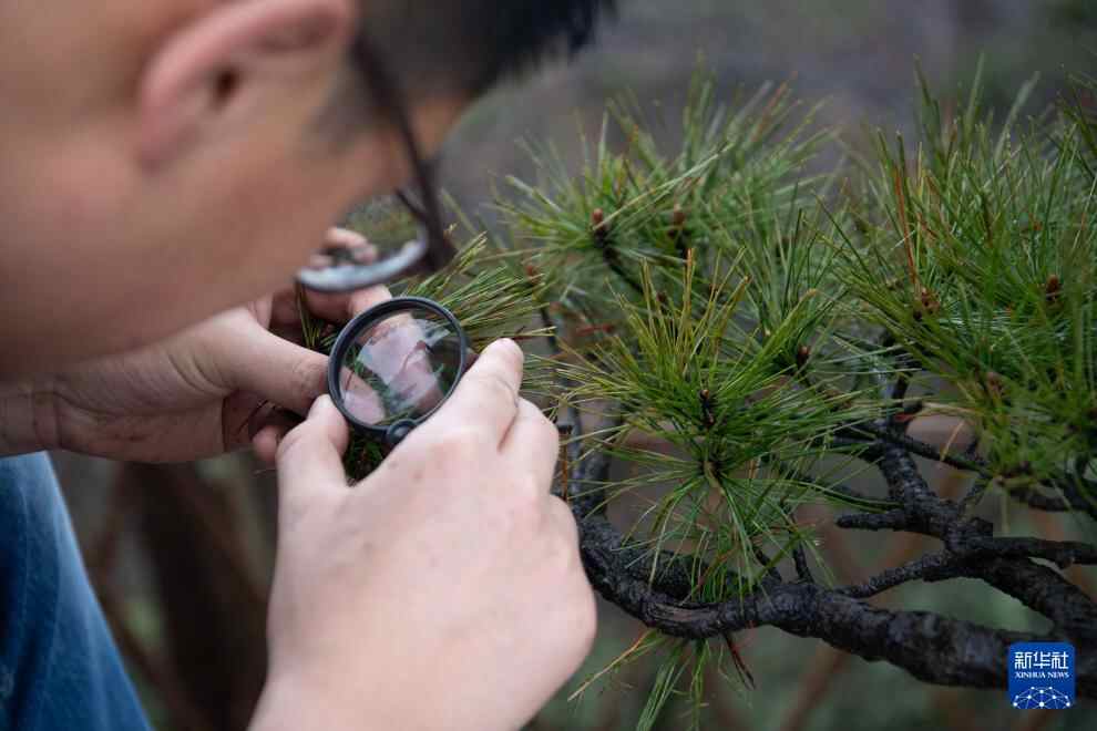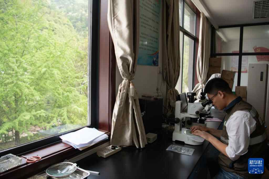 2025年4月23日,黄山风景区管理委员会园林局高级工程师吴贻军通过显微镜鉴定黄山松林业有害生物种类。