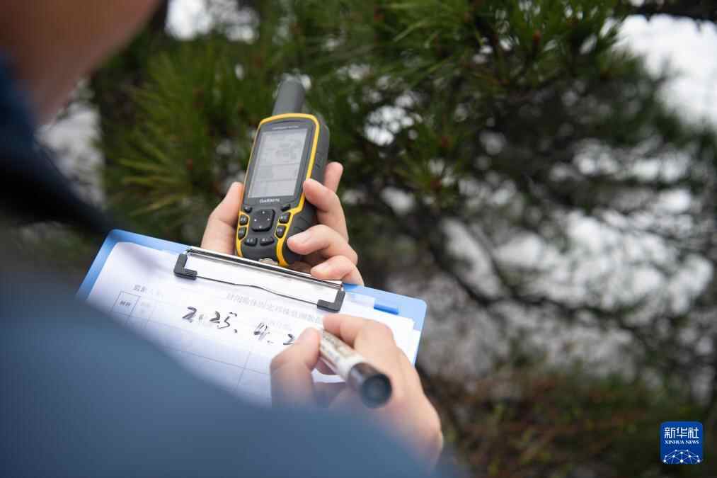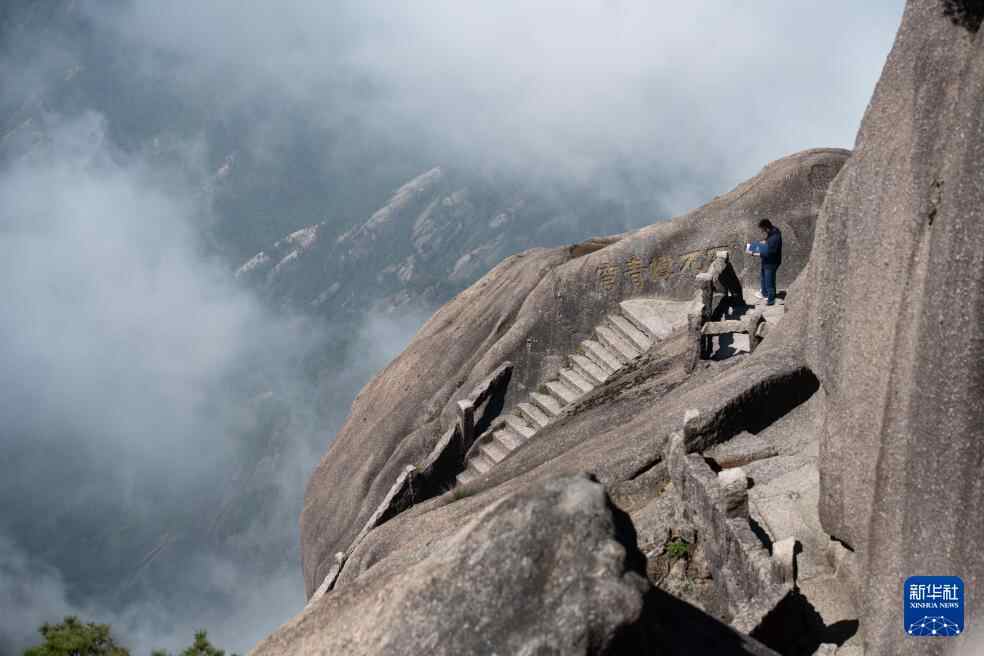 2025年4月22日,黄山风景区管理委员会园林局高级工程师吴贻军在封闭轮休中的莲花峰景点记录黄山代表性植物的位置信息。