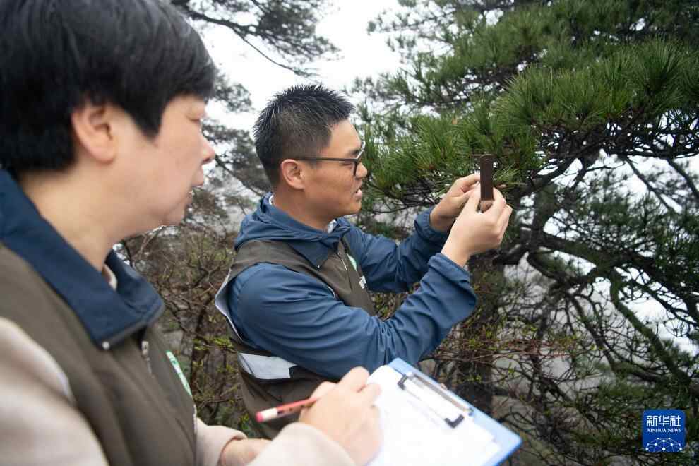 2025年4月22日,黄山风景区管理委员会园林局高级工程师吴贻军(右)和同事汤明霞在封闭轮休中的莲花峰景点检测代表性植物黄山松梢头生长量。