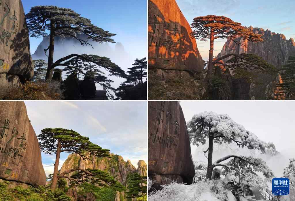 拼版照片:“守松人”胡晓春拍摄的黄山迎客松(上左为2018年1月5日摄,上右为2020年10月13日摄,下左为2021年7月20日摄,下右为2022年2月18日摄)。