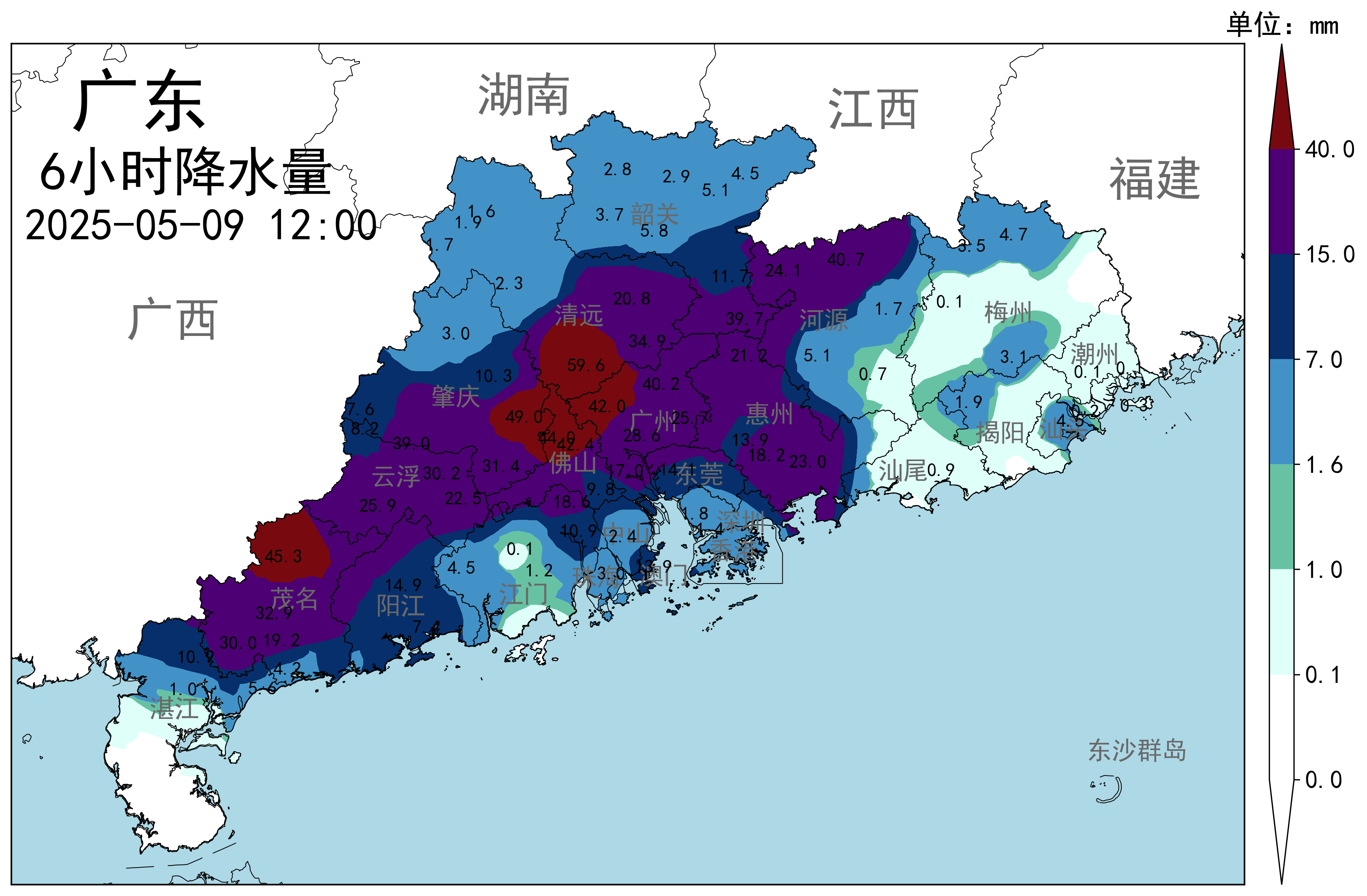 广东省气象台5月9日预计,9日余下时间至10日,广东大部分市县仍有大雨到暴雨局部大暴雨,最强降水时段在9日白天,同时伴有8~10级局地11~12级的雷雨大风、局地小冰雹等强对流天气,主要落区为粤北偏南市县、珠江三角洲和粤西市县,局地雨势强烈。预计11日至12日广东大部市县转晴到多云,昼夜温差大。