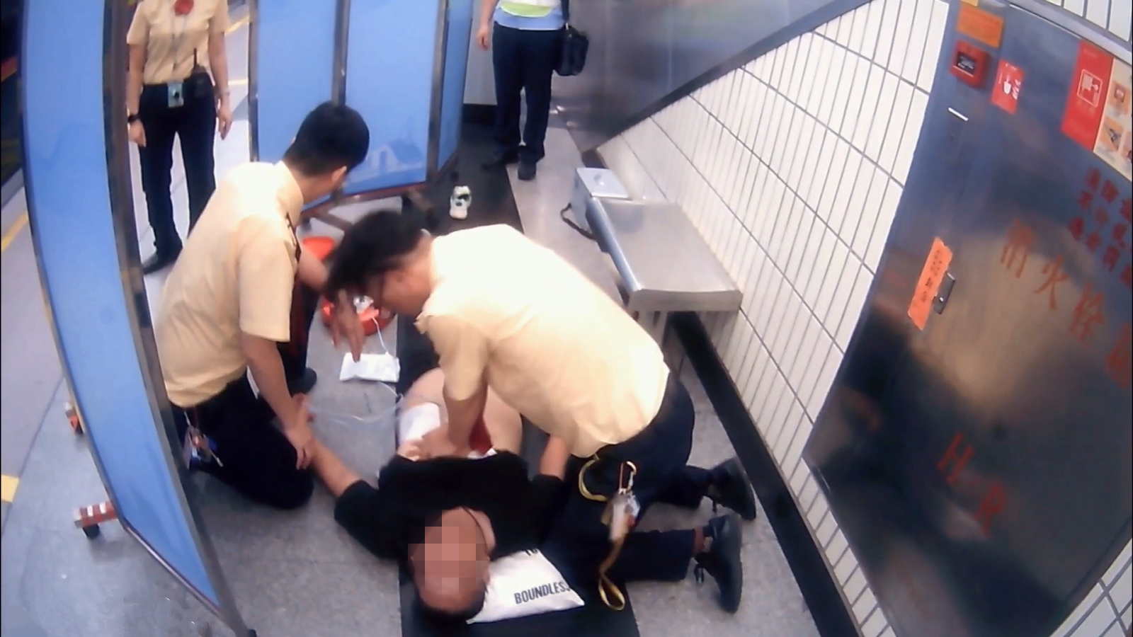 何燕婷等几名站务人员闻讯随即赶到,与另一热心乘客和保洁班长钟志全,合力将男乘客转移到一旁的站台座椅上休息。值班站长李东龙、值班员许维玮赶到现场,站务员李其容、何燕婷则取来药箱及AED设备,李东龙察觉乘客开始面色发紫、四肢僵直,便立即俯身,通过触摸颈动脉、贴耳听呼吸,发现乘客已出现心跳、呼吸骤停。“快上AED!”一声令下,一场生死救援旋即展开。工作人员取来折叠屏风,围蔽出急救区域,并疏散周围乘客,保持空气流通,车站同步启动广播:“现场有乘客突发疾病,如有医护人员请速到站台协助!”