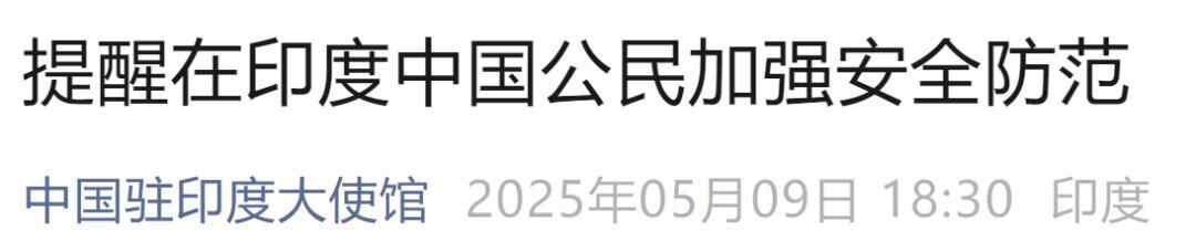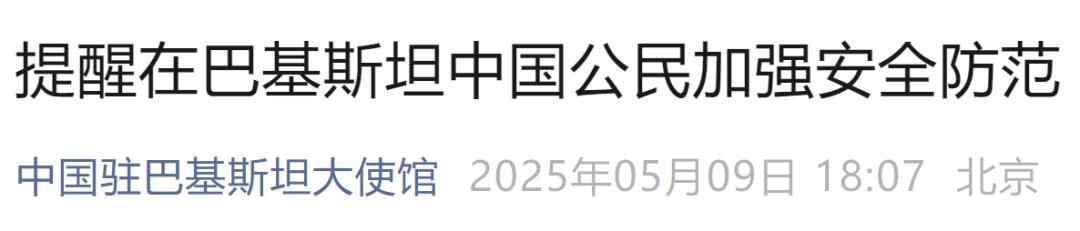 5月9日,中国驻印度大使馆、中国驻巴基斯坦大使馆发文提醒中国公民加强安全防范。