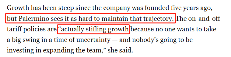 初创企业也受到了类似影响。一家成立于5年前的美国个人护理品牌此前增长趋势极好,但在其负责人看来,未来很难保持这样的增长,因为没人愿意在不确定的时期大展拳脚,也不会有人愿意扩大投资,关税政策实际上“扼杀了增长”。