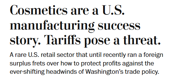 《华盛顿邮报》网站近期发布的一篇文章聚焦了关税对美国美妆与个护产品制造业的影响。报道称,在行业和分析人士看来,美国政府加征的高额关税扰乱了美妆产品的供应链,这一政策实际上会阻碍这一数十年来美国具备国际竞争优势的行业的发展。