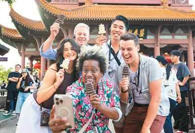 外国游客在湖北武汉黄鹤楼前手持文创雪糕拍照。何宇欣摄