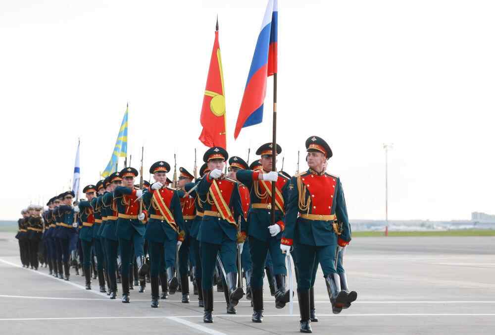 俄方在机场举行隆重迎接仪式。军乐团奏中俄两国国歌。习近平检阅仪仗队并观看分列式。