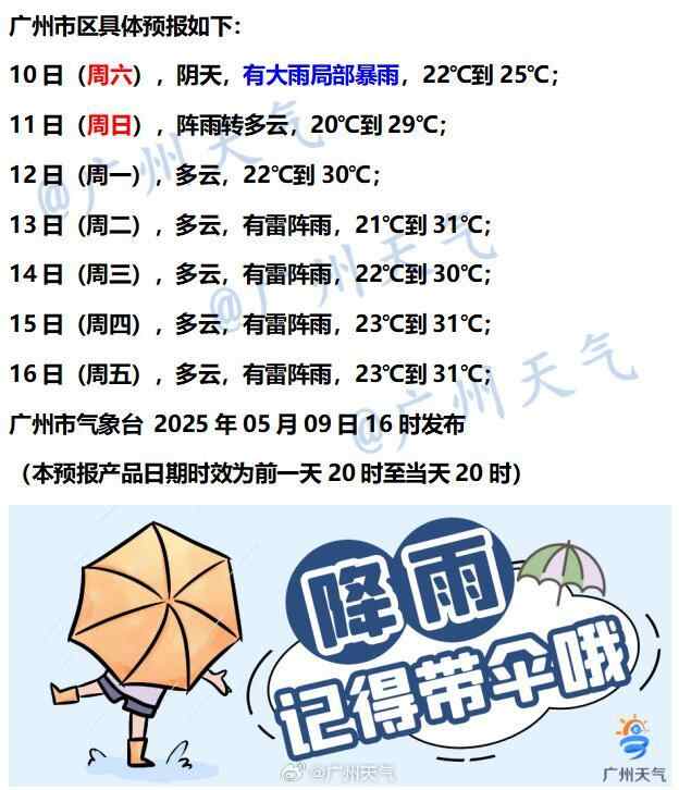 广州气象台预计,今天受偏南风北推影响,广州市仍有强降水,局部伴有短时强降水等强对流天气,11日起阵雨转多云。