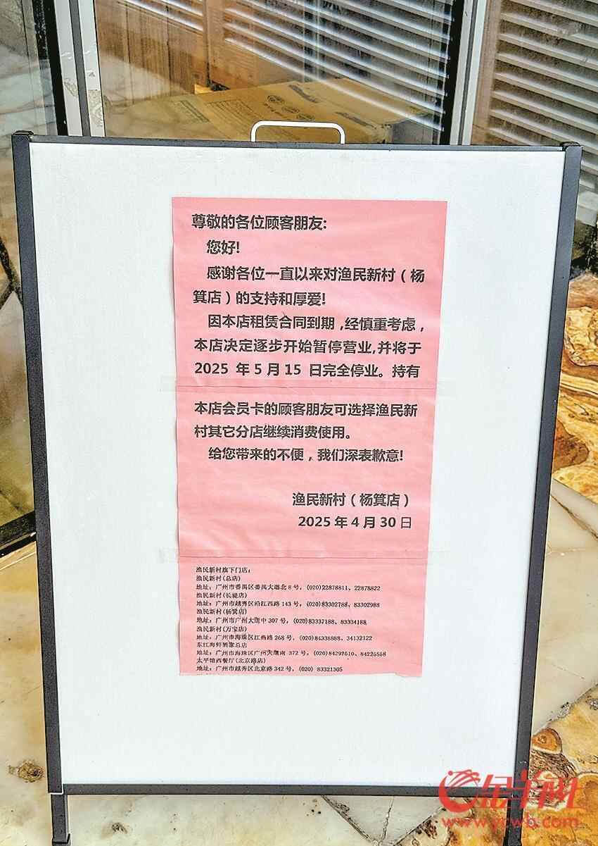 记者5月7日中午在渔民新村(杨箕店)看到,餐厅在一楼入口设置了告示,提醒顾客因租赁合同到期,该店将逐步暂停营业,并将在5月15日完全停业;该告示同时提醒使用充值会员卡的顾客仍可持会员卡到渔民新村旗下其他分店消费。