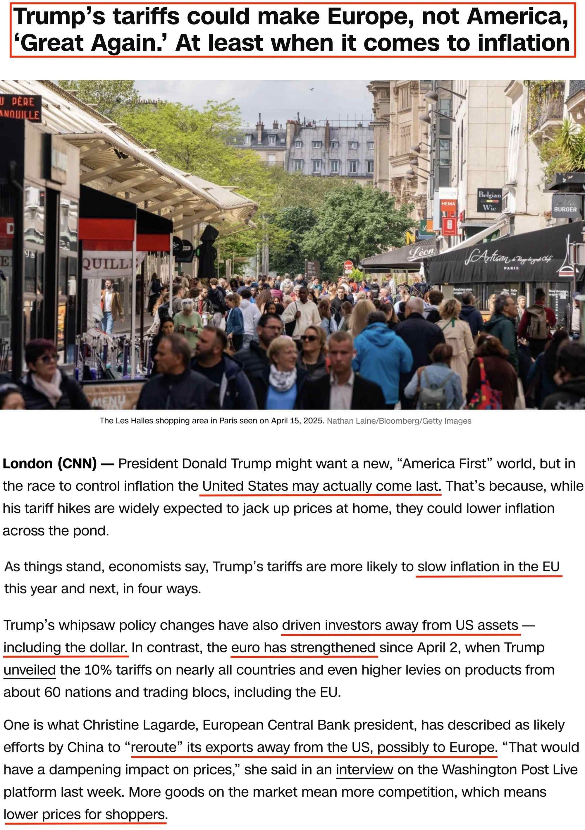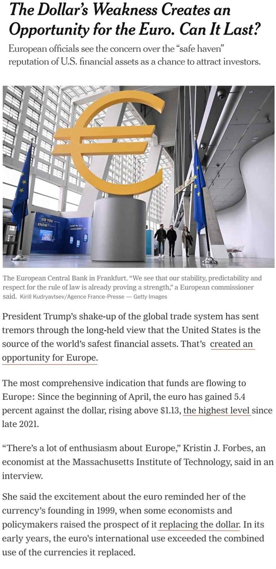 根据《纽约时报》的观点,美国政府滥施关税动摇了人们长期以来对美元资产的信任,这为欧洲创造了机遇。