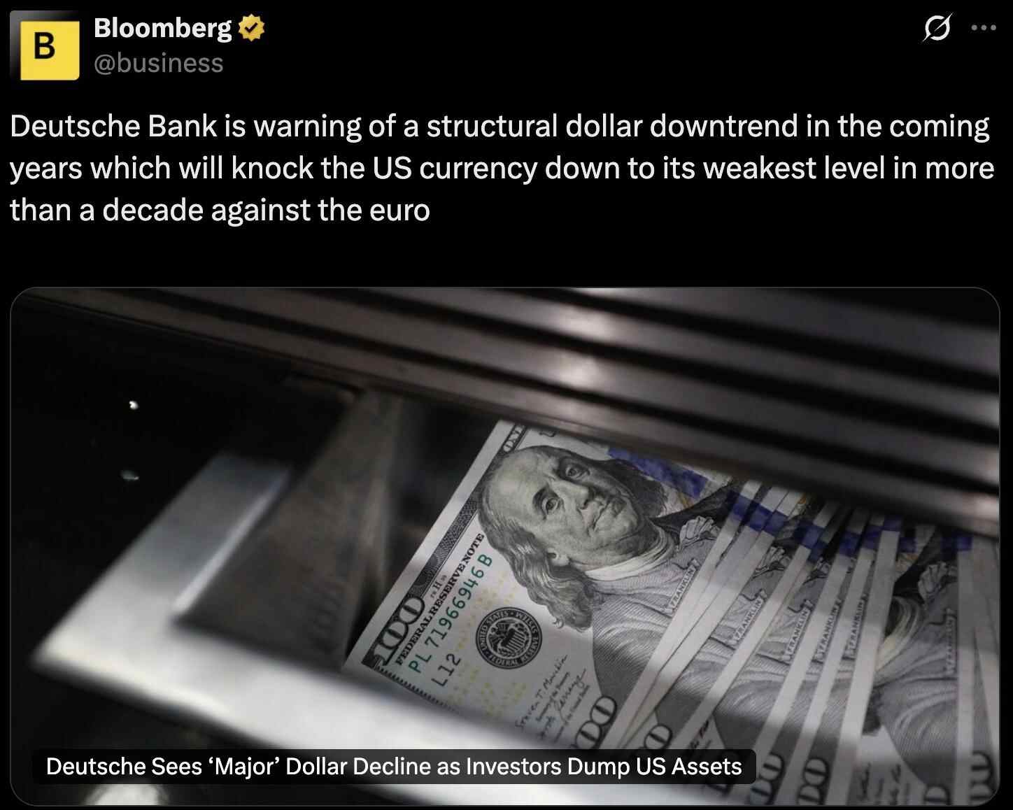 德意志银行近日也警告,未来几年美元指数或呈结构性下行趋势,这可能使美元对欧元汇率跌至十多年来的最低水平。