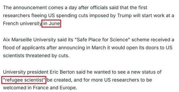 据悉,第一批“逃离”美国的科研人员将于6月正式开始在法国大学工作。