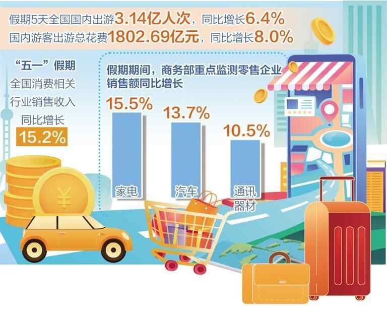 国家税务总局最新增值税发票数据显示,“五一”假期,全国消费相关行业销售收入同比增长15.2%,其中消费品“以旧换新”政策带动家电及通讯器材类商品消费需求旺盛,家居用品及珠宝首饰消费增幅较高,个性化旅游服务消费受到青睐。