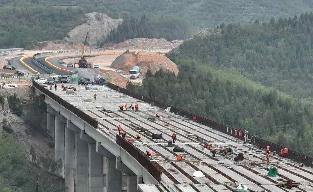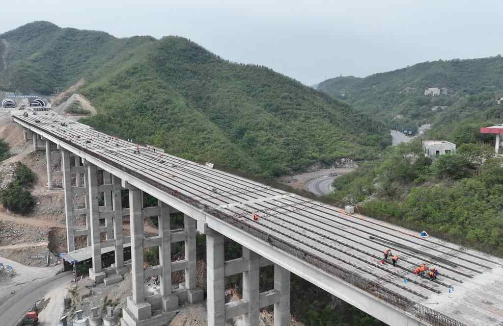 5月7日,工人在石太高速公路改扩建项目核桃园4号桥建设工地施工(无人机照片)。