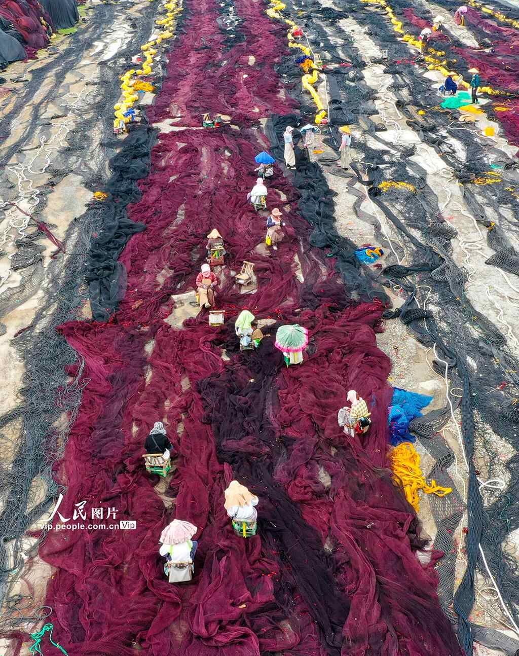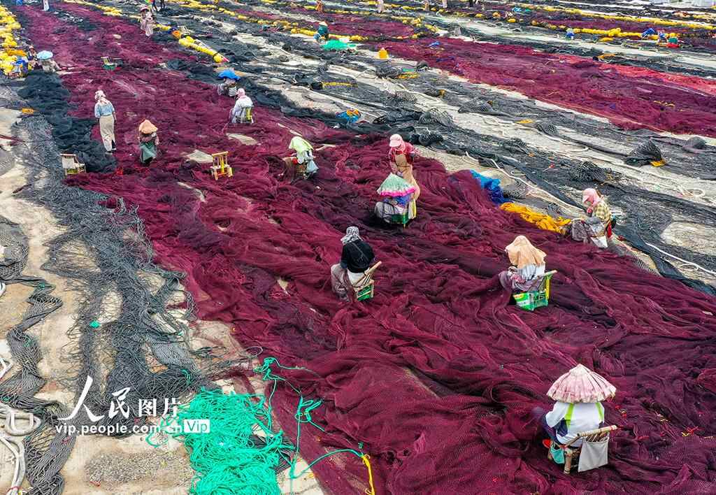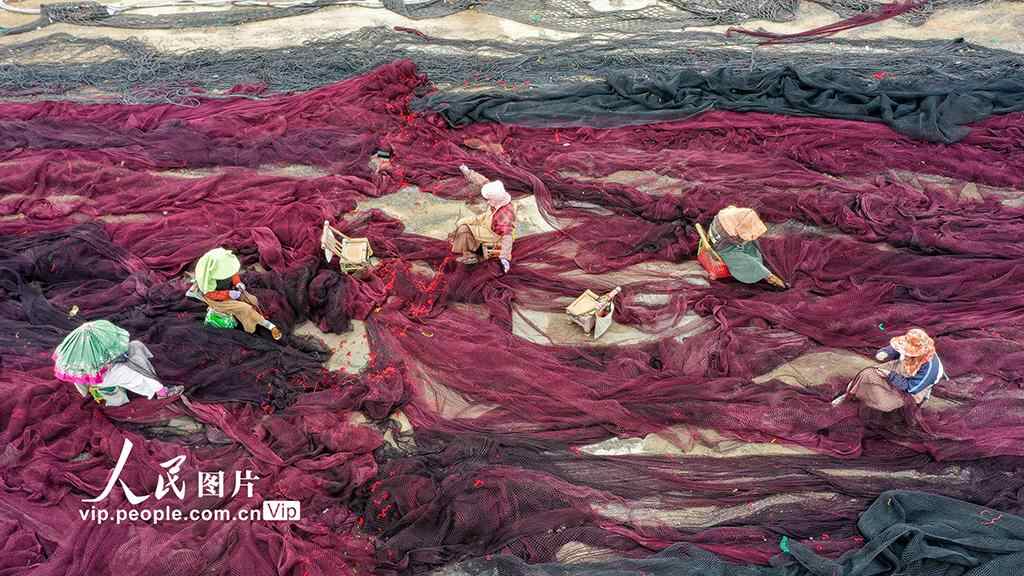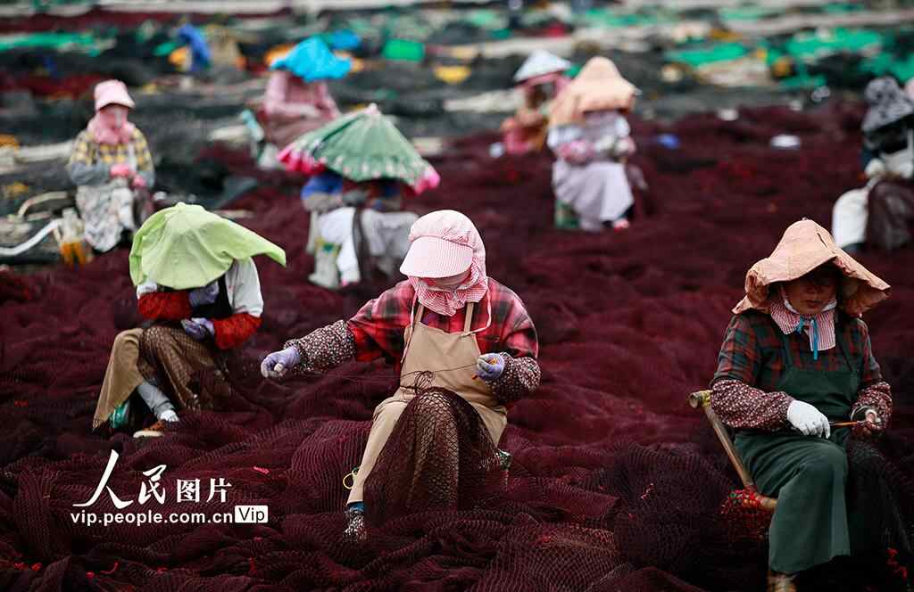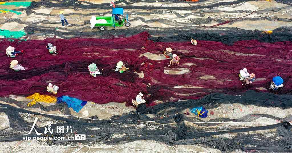 眼下,正是东海伏季休渔期,浙江省温岭市石塘镇渔家妇女们抓紧修补渔网。周学军摄(人民图片网)