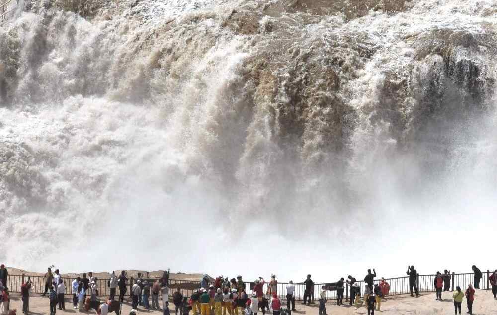 2025年4月9日,游客在山西吉县黄河壶口瀑布景区欣赏壮美的“桃花汛”。新华社发(吕桂明摄)