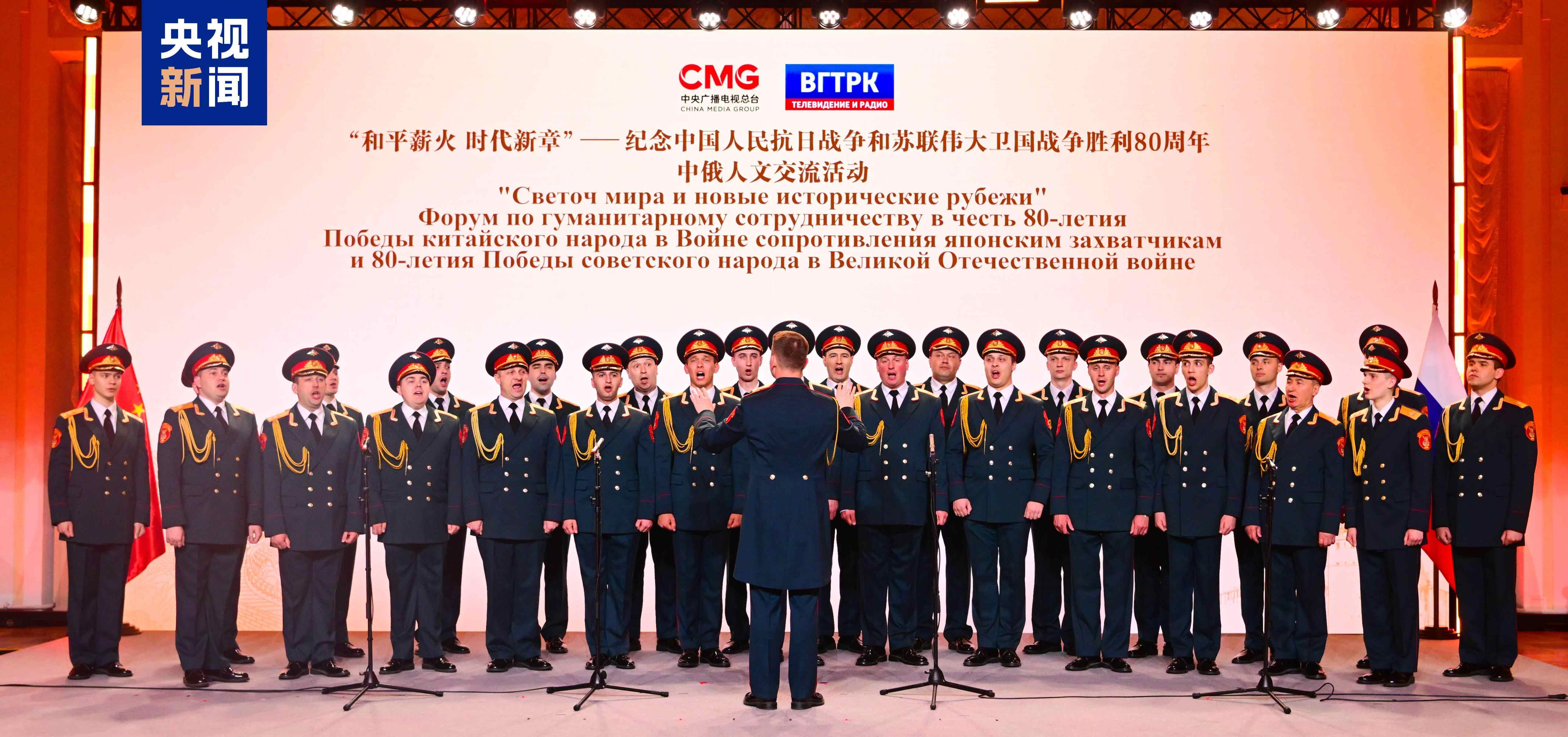 俄罗斯亚历山德罗夫红旗歌舞团现场用中俄双语倾情演唱中国歌曲《游击队歌》和俄罗斯歌曲《胜利日》,热烈欢迎中国国家主席习近平对俄罗斯进行国事访问并出席纪念苏联伟大卫国战争胜利80周年庆典,以歌声铭记历史、传递和平,赓续中俄传统友谊。
