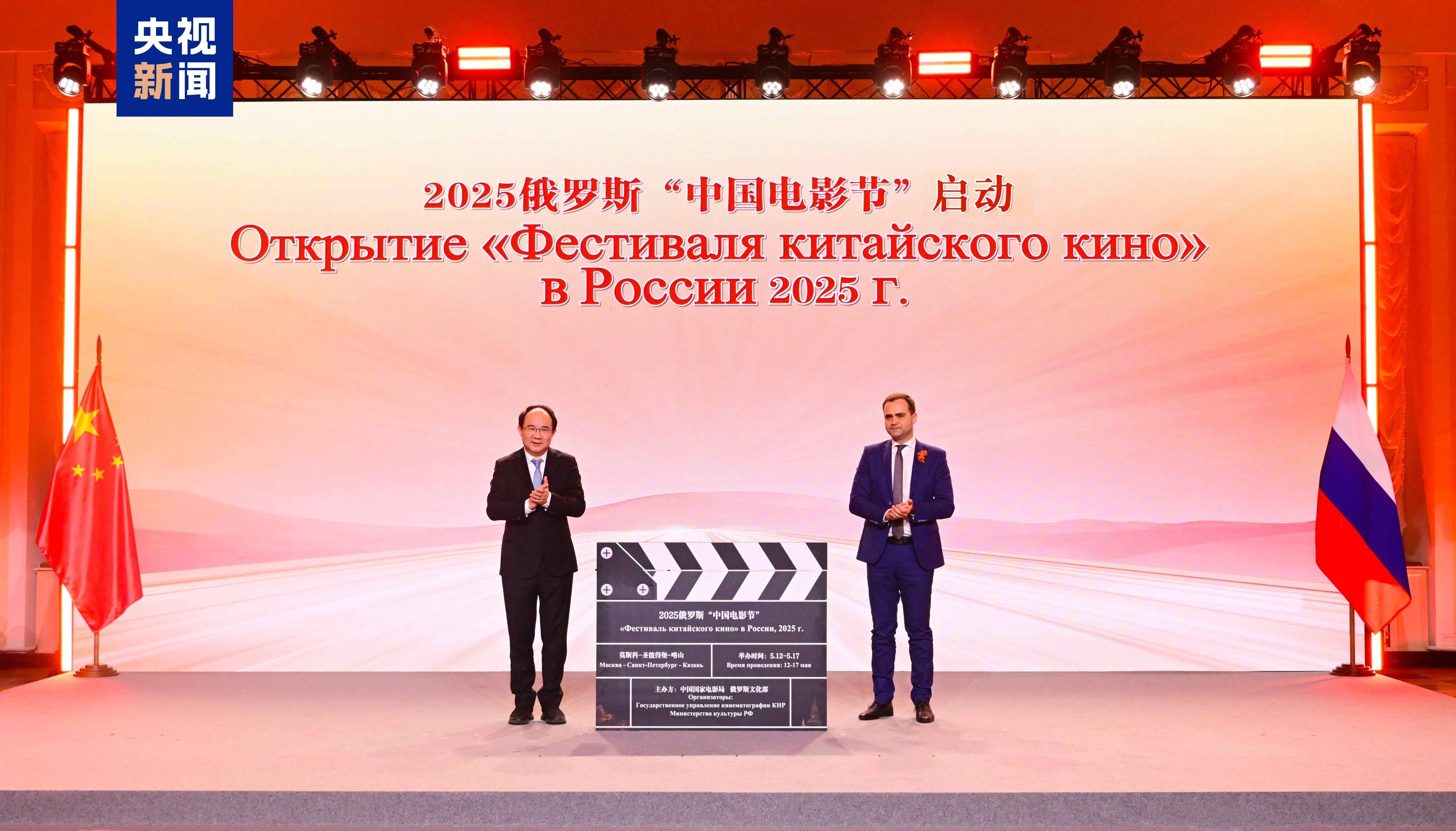 △中国国家电影局常务副局长毛羽与俄罗斯国家电影基金会总经理阿克肖诺夫共同启动2025年俄罗斯“中国电影节”