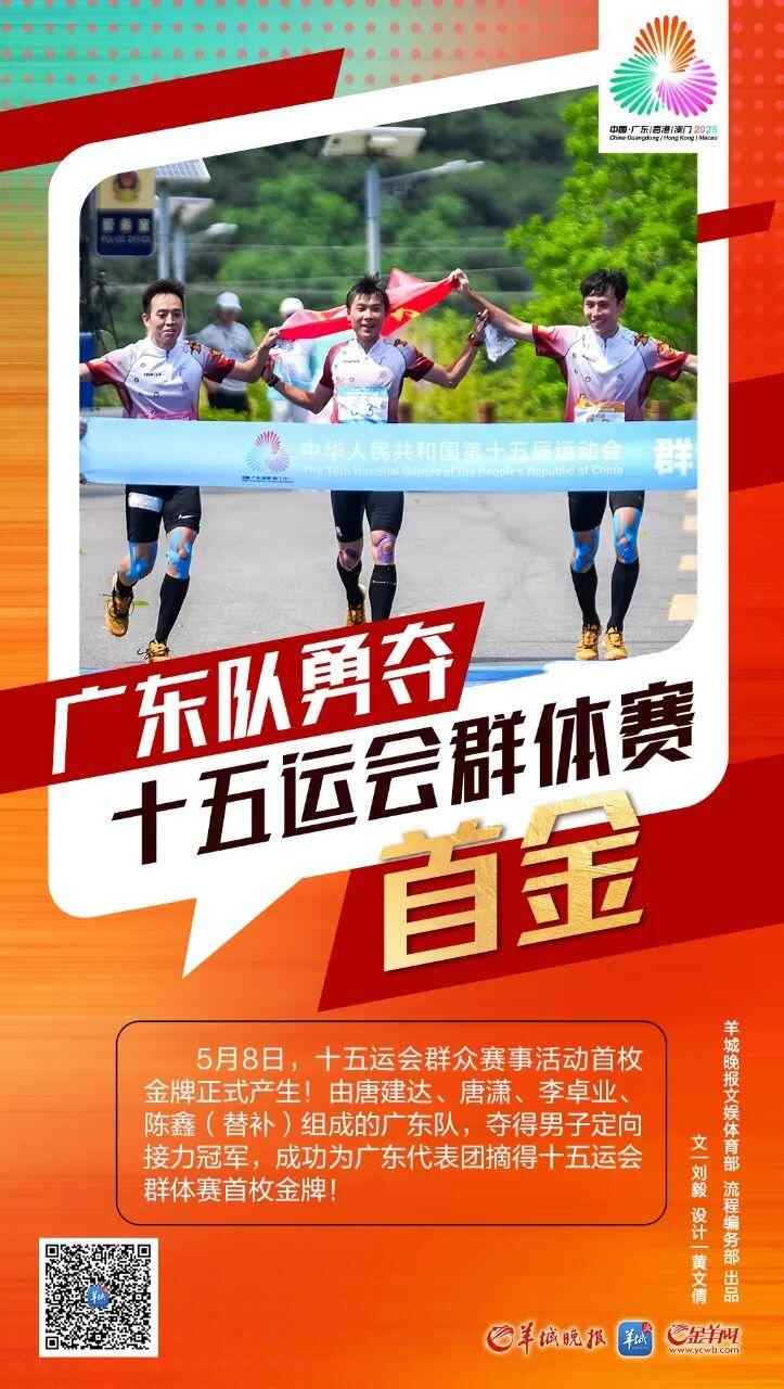 5月8日,十五运会群众赛事活动首枚金牌正式产生。由唐建达、唐潇、李卓业、陈鑫(替补)组成的广东队,以1小时43分19秒夺得男子定向接力冠军,成功为广东代表团摘得十五运会群体赛首枚金牌。