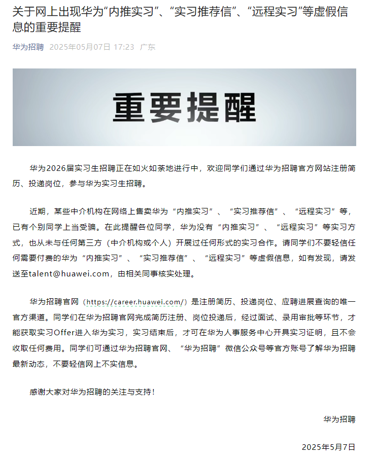 5月7日,“华为招聘”微信公众号发文提醒:华为2026届实习生招聘正在进行中。近期,某些中介机构在网络上售卖华为“内推实习”“实习推荐信”“远程实习”等,已有个别同学上当受骗。
