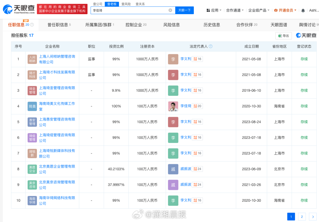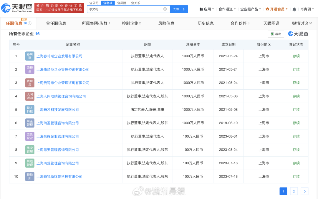 据潇湘晨报消息,记者查询天眼查商业履历信息发现,李文利名下关联16家企业,其中12家为存续状态,包括上海春琦瑞企业发展有限公司、上海盛琦圣企业管理咨询有限公司、上海贵琦忠企业管理咨询有限公司等,涉及企业管理、科技、新媒体等领域,李文利在上述企业中担任执行董事、法定代表人等职务。