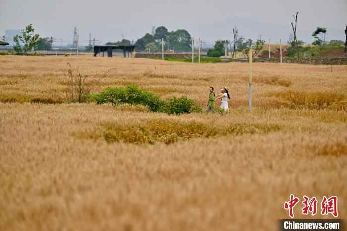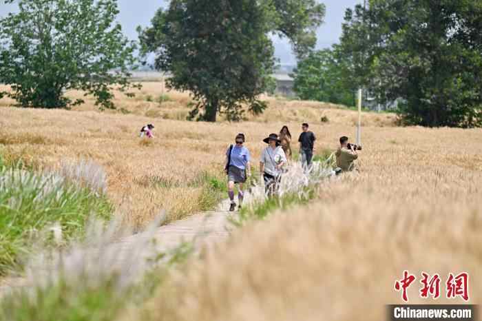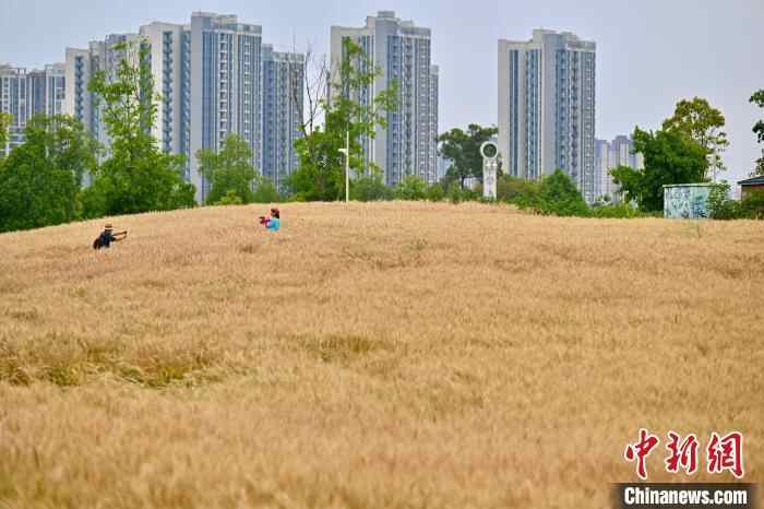 5月8日,位于四川省成都市龙泉驿区大面街道境内的麦田景观吸引民众打卡拍照。进入夏天,成都环城绿道两旁的麦子成熟待收,变成金黄色,成为近郊一道靓丽风景。中新社记者 张浪 摄