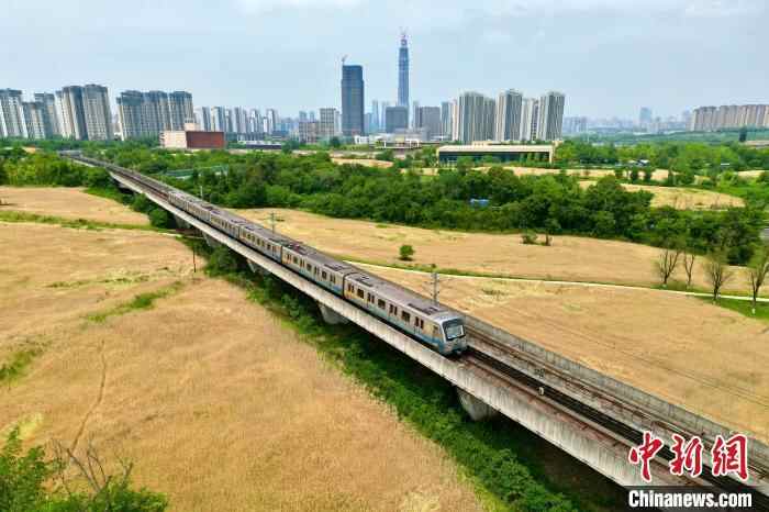 5月8日,四川成都,列车穿越金色麦田。进入夏天,成都环城绿道两旁的麦子成熟待收,变成金黄色,成为近郊一道靓丽风景。(无人机照片)中新社记者 张浪 摄
