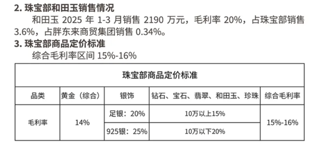 此外,胖东来商贸集团4月9日还公布一季度经营数据,一季度集团整体销售约62.7亿元。净利约3亿元,税金约2.68亿元。其中,珠宝净利为2583万元。和田玉一季度销售额为2190万元,毛利率20%,占珠宝部销售3.6%,占集团总销售额0.34%。集团珠宝部综合毛利率为15%至16%。