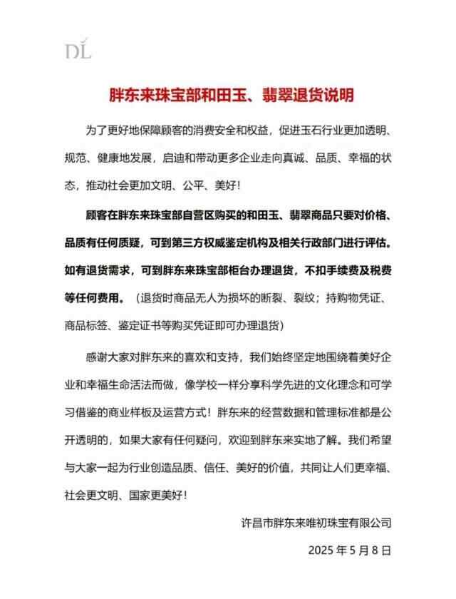 5月8日,胖东来发布和田玉、翡翠退货说明。