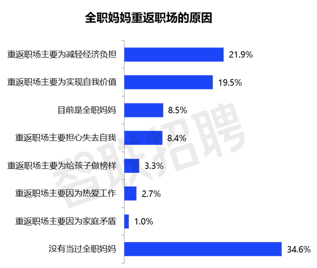 调研数据显示,职场妈妈群体存在显著的职业连续性断裂现象,65.3%的职场妈妈做过全职妈妈,56.7%因各种原因重返职场。论及原因,为减轻经济负担的占比最多,为21.9%,其次为实现自我价值,占比19.5%。
