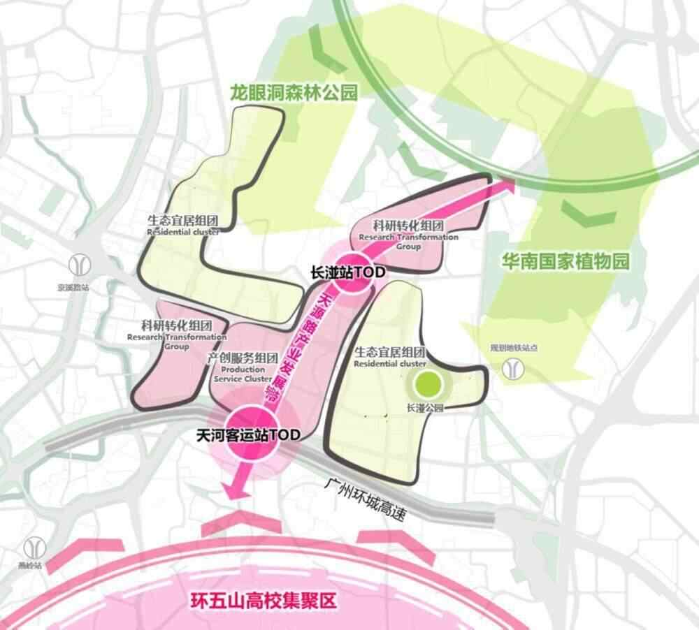 规划总体结构是“一轴两芯三组团”。其中,“一轴”即天源路产业发展轴,发展科创产业研发办公、企业孵化等产业服务以及商住办公等生活服务;“两芯”是天河客运站和长湴站的TOD科创服务核芯,是环五山片区的科创产业引擎之一;“三组团”为产创服务组团、科研转化组团、生态宜居组团。