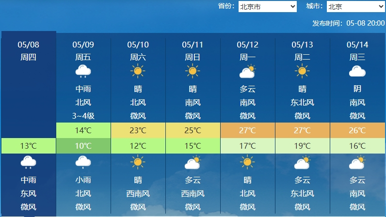 城市中,像是北京,明天午后气温将会倒降,比凌晨还低,只有10℃左右。提醒大家早晨出门多带一件外套,下班时可能会用得到。