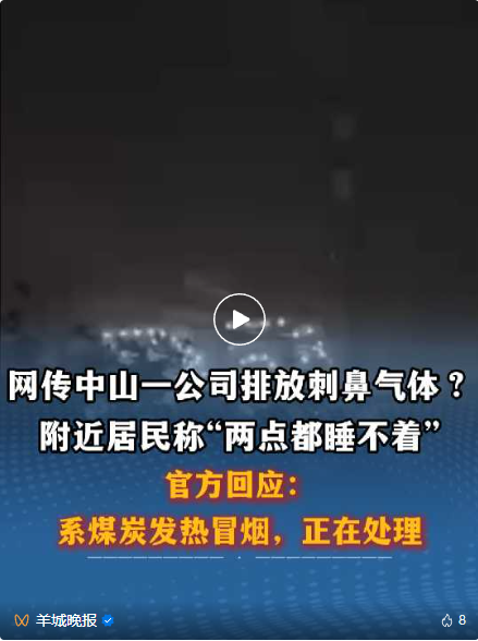 5月7日,有网友发视频称,位于广东中山市黄圃镇的粤海能源有限公司疑似排放不明气体,影响居民生活。在该视频的评论区,有网友称夜晚气味刺鼻,“关窗都不行,半夜两点还没睡着”。