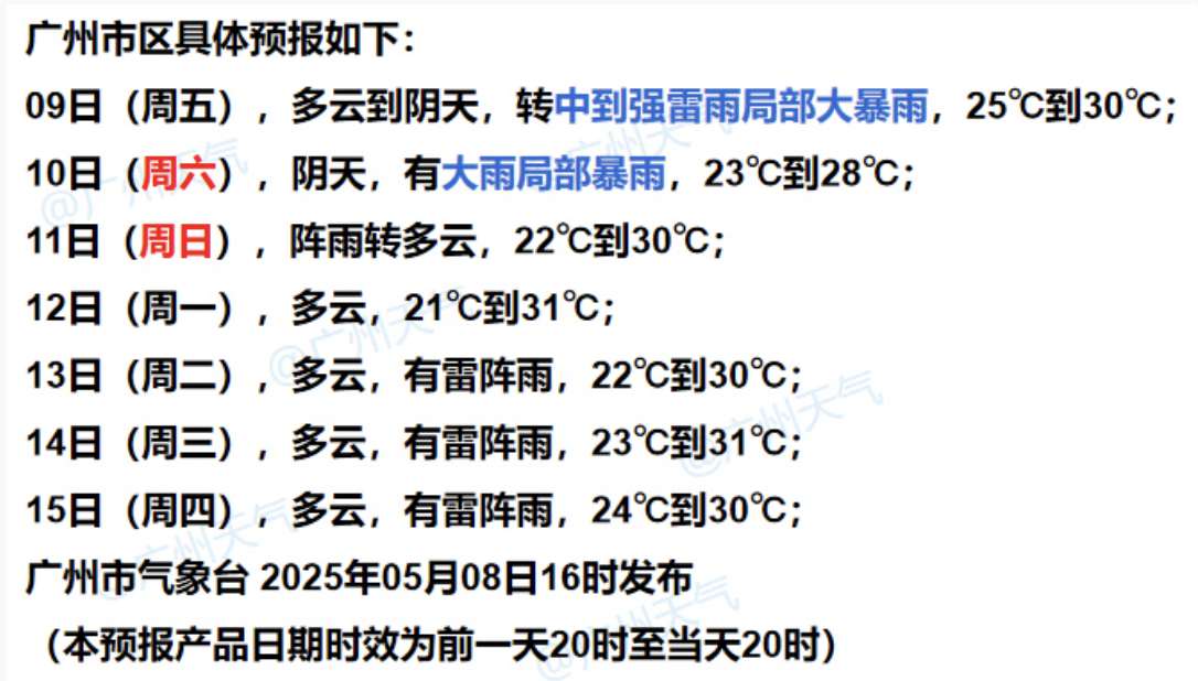 广州市气象台预计,9日中午前后广州将自北向南转雨。预计9日中午至夜间,广州自北向南将有8-10级(局地11-12级)大风、短时强降水、强雷电及局地小冰雹的天气过程。10日凌晨至中午,广州仍有7-9级阵风、短时强降水和雷电。11日起广州雨渐止转多云。