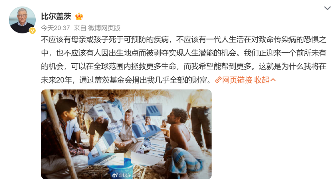 盖茨在文章中写道:“当前有太多亟待解决的问题,我不应该把本可以用于帮助他人的资源据为己有。因此,我决定比原计划更快地把我的财富回馈社会。未来20年,我将通过盖茨基金会捐出我几乎全部的财富,用来挽救和改善世界各地的生命。”
