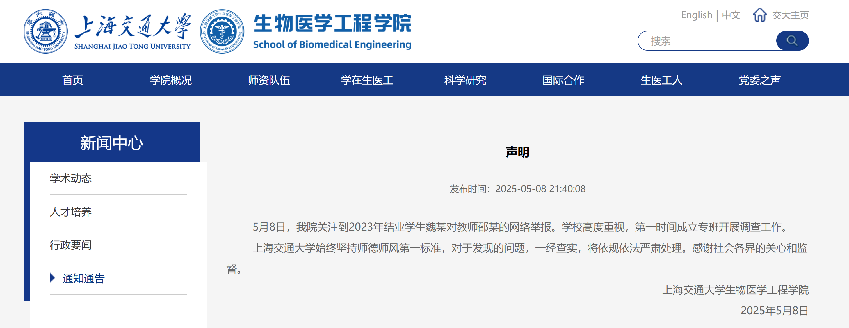 针对此事,上海交通大学生物医学工程学院5月8日晚发布声明称:我院关注到2023年结业学生魏某对教师邵某的网络举报。学校高度重视,第一时间成立专班开展调查工作。上海交通大学始终坚持师德师风第一标准,对于发现的问题,一经查实,将依规依法严肃处理。感谢社会各界的关心和监督。