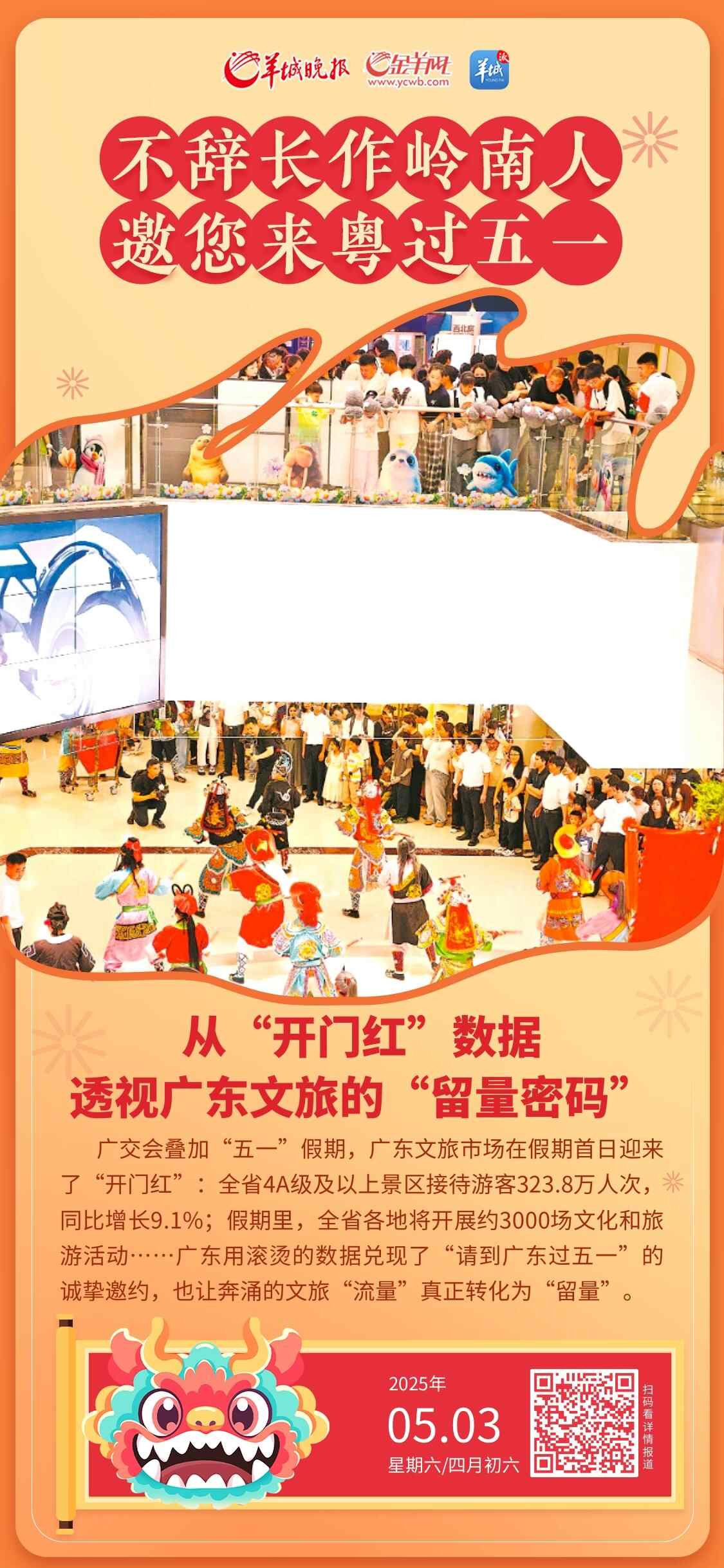 广交会叠加“五一”假期,广东文旅市场在假期首日就迎来了“开门红”:全省4A级及以上景区接待游客323.8万人次,同比增长9.1%;携程上广东酒店订单量同比增长40%,机票订单量同比增长17%;假期里,全省各地将开展约3000场文化和旅游活动……广东用滚烫的数据兑现了“请到广东过五一”的诚挚邀约,也让奔涌的文旅“流量”真正转化为“留量”。