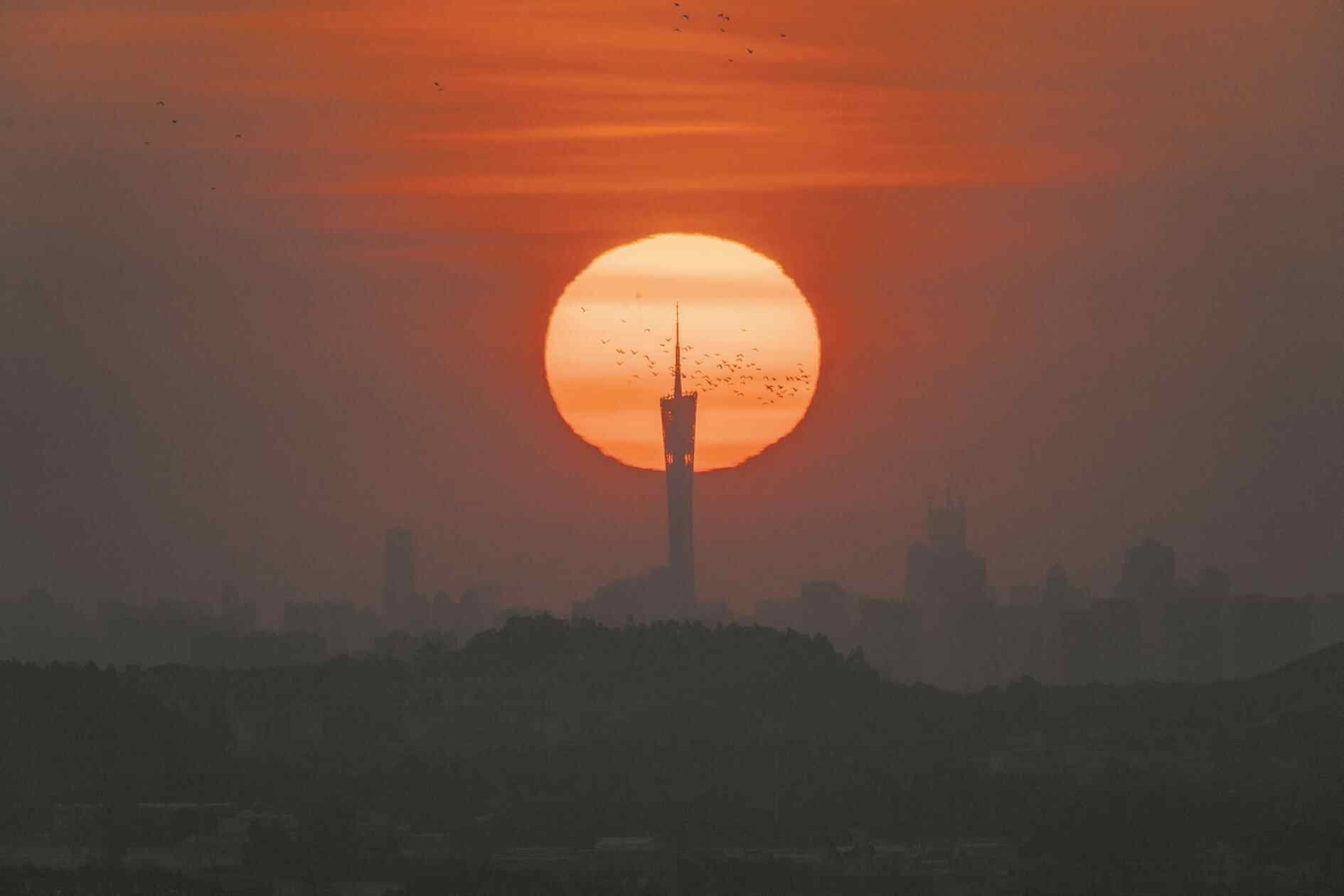 通过自己日常观察,以及网络上他人的分享,陈冲在地图上标记了几百个能拍到广州塔的点位,最远去到40多公里外的佛山三水,旭日初升时,他拍到群鸟飞经塔尖。