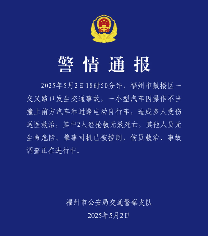 央视网消息:据福州市公安局交通警察支队,2025年5月2日18时50分许,福州市鼓楼区交叉路口发生交通事故,一小型汽车因操作不当撞上前方汽车和过路电动自行车,造成多人受伤送医救治,其中2人经抢救无效死亡,其他人员无生命危险。肇事司机已被控制,伤员救治、事故调查正在进行中。