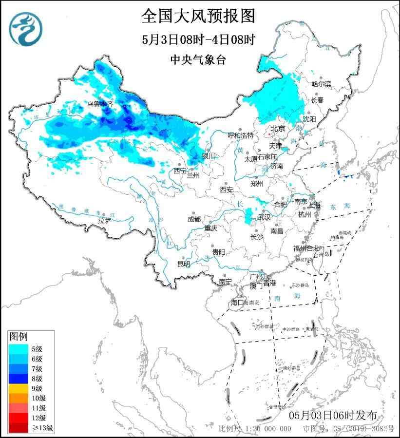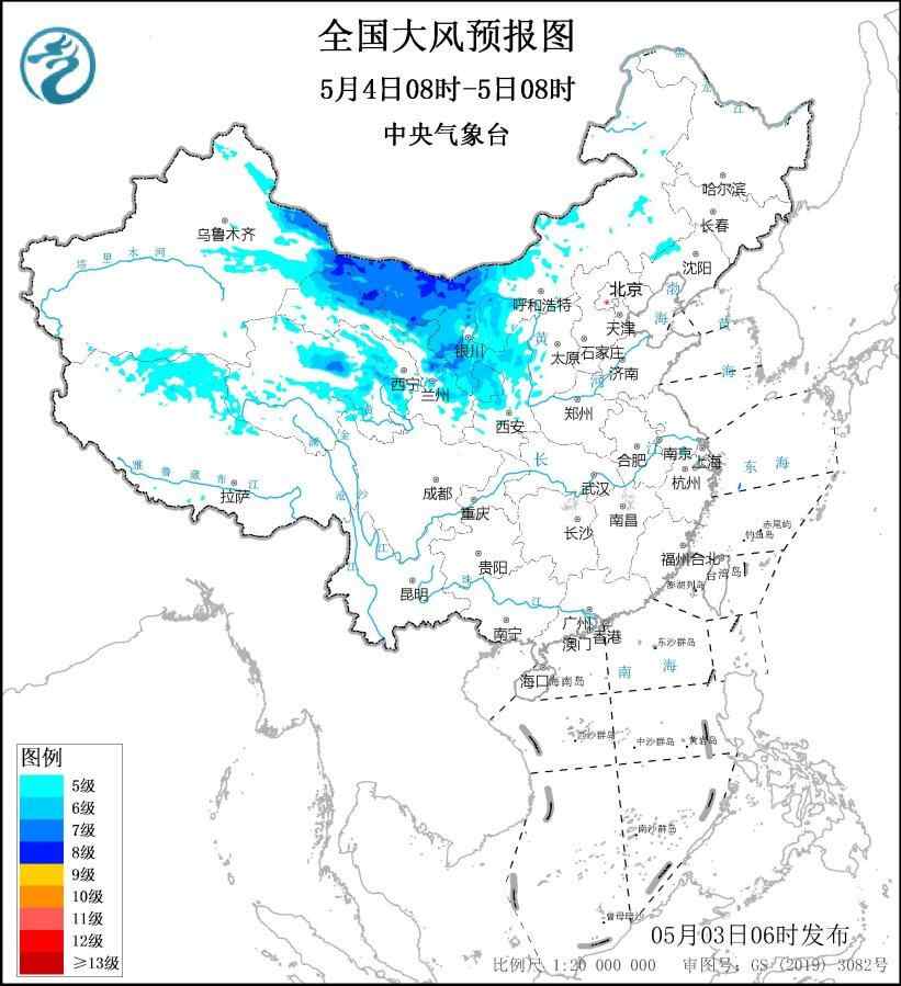 5月4日08时至5日08时,新疆东部、内蒙古中西部、青海东部和北部、甘肃大部、宁夏、陕西北部等地有5~7级、阵风8~10级、局地11级的大风。
