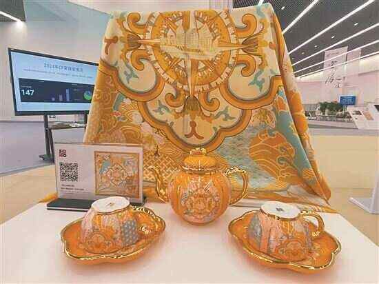 “这一项产品是为纪念共建‘一带一路’倡议10周年而创作的。”江苏苏豪国际集团股份有限公司副总程红梅指着获得金奖的作品“海上丝绸之路套件”向记者介绍,“本款陶瓷为江苏南京高淳国瓷,有中国当代官窑之称,产品质感细腻,花型与丝巾花型成系列。丝巾采用目前最新数码双面同色喷绘印花工艺,纯手工卷边。”