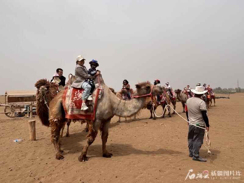 5月2日,游客在库木塔格沙漠风景名胜区骑乘骆驼。石榴云/新疆日报记者 张小宓摄