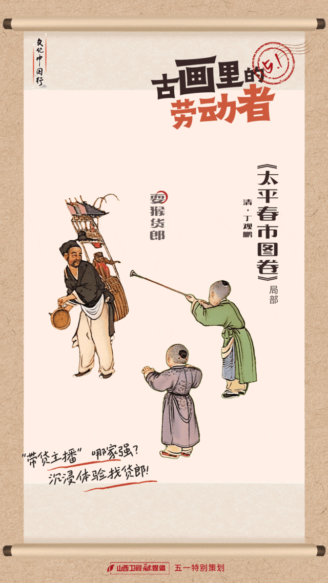 太平春市图卷:清代丁观鹏作,此图描绘了新春农村热闹欢庆春节情景,各种行业的耍猴货郎、算命、跑旱船等表演艺人。