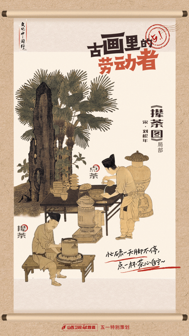 撵茶图:宋代刘松年作,画中呈现的是宋代点茶法。一人跨坐矮几,手推茶磨撵茶。另一人则立于桌边,左持茶盏,右执茶瓶正在点茶。画面充分展示了文人品茶的生动场面,再现了两宋流行的点茶技艺。