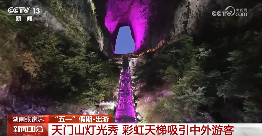 “五一”假期,湖南天门山景区以自然风光吸引中外游客。随着夜幕降临,天门山山体被五彩灯光点亮,999级彩虹台阶灯光流转,远看就像一道连通天地的彩虹桥,将千年奇观天门洞装点得更加巍峨壮观。