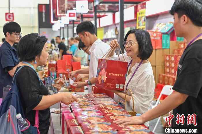 在澳门展馆,各种美食、咖啡和葡萄酒吸引采购商前来品尝,其中,澳门妈阁饼家的展位前挤满了试吃者。